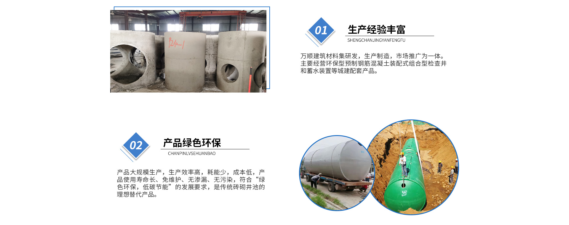黃山市萬(wàn)順建筑科技有限公司是集研發(fā),生產(chǎn)制造,市場(chǎng)推廣為一體的綜合性企業(yè)。公司主要經(jīng)營(yíng)環(huán)保型預(yù)制鋼筋混凝土裝配式組合型檢查井和蓄水裝置等城建配套產(chǎn)品。產(chǎn)品生產(chǎn)過(guò)程采用獨(dú)特的生產(chǎn)工藝,機(jī)械化流水作業(yè)。產(chǎn)品大規(guī)模生產(chǎn),生產(chǎn)效率高,耗能少,成本低,產(chǎn)品使用壽命長(zhǎng)、免維護(hù)、無(wú)滲漏、無(wú)污染,符合“綠色環(huán)保,低碳節(jié)能”的發(fā)展要求,是傳統(tǒng)磚砌井池的理想替代產(chǎn)品。